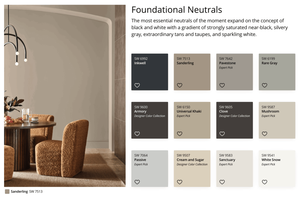 Design experts confirm that “cremèle neutrals”—creamy and caramel shades—are being chosen over crisp white and stark gray. The Foundational Neutrals palette is your go-to for creating a sophisticated backdrop that aligns with the trend of nature-inspired elegance and works seamlessly with natural wood tones and brass hardware.