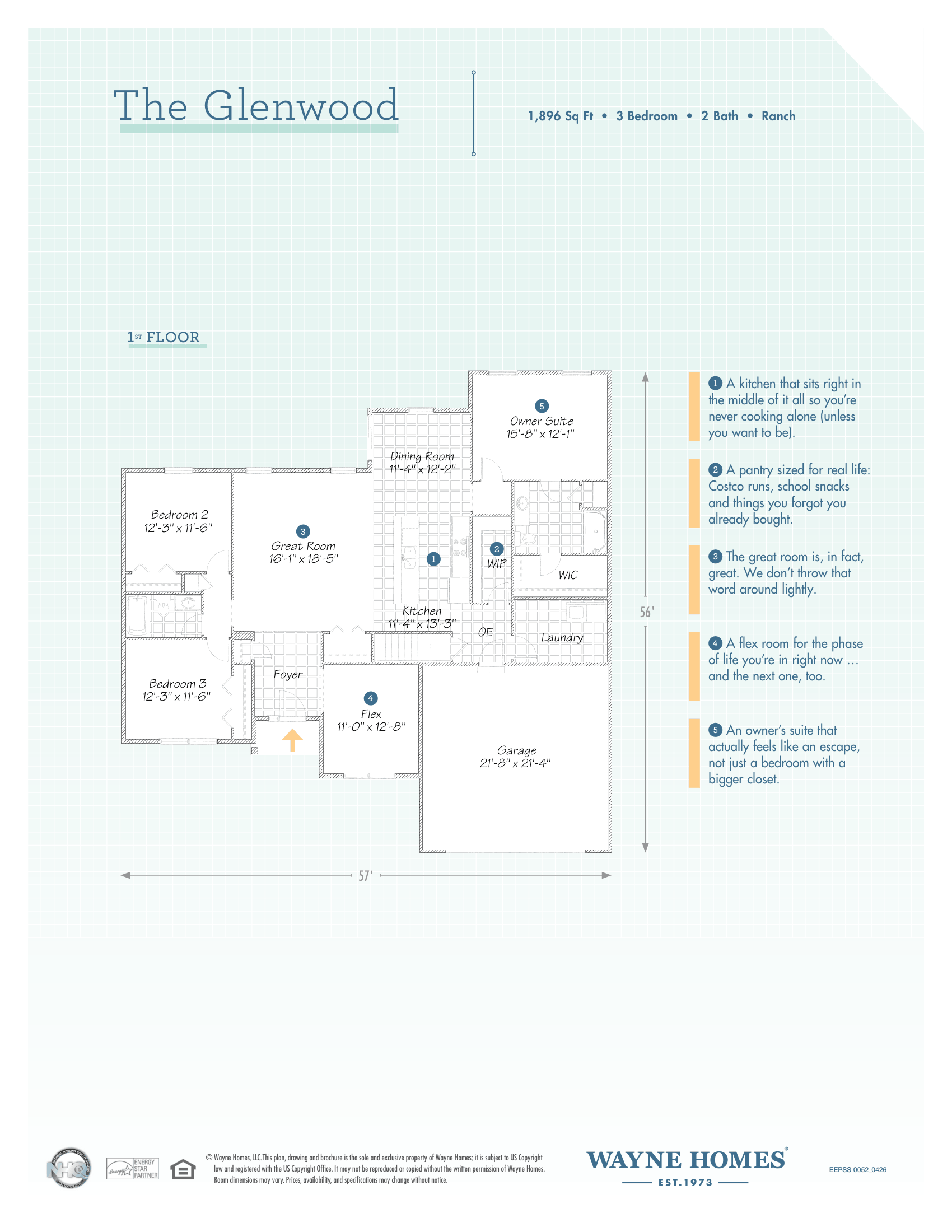 The Glenwood keeps things simple, which is harder to pull off than it sounds. At 1,896 square feet, it flows the way a home should: kitchen in the middle of it all, dining right where you’d want it, and enough separation between bedrooms to keep the peace. Add in a flex room and you’ve got a home that feels thoughtful, practical, and refreshingly easy to live in.